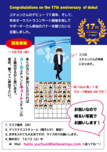 Believe in YUでは、ユチョンさんのデビュー17周年祝いとオーケストラコンサートの開催を祝してフラワースタンドとロールアップバナーなどを贈る企画が進行中です。