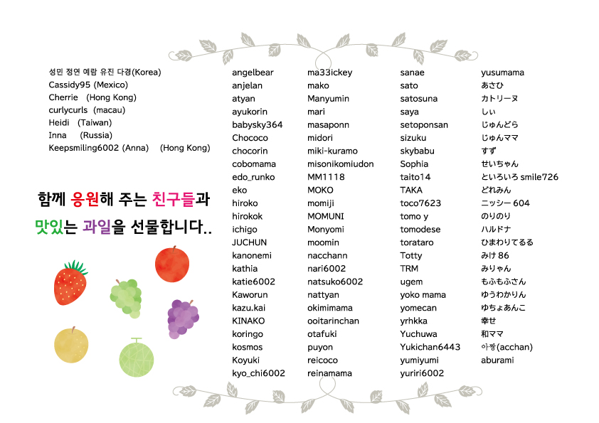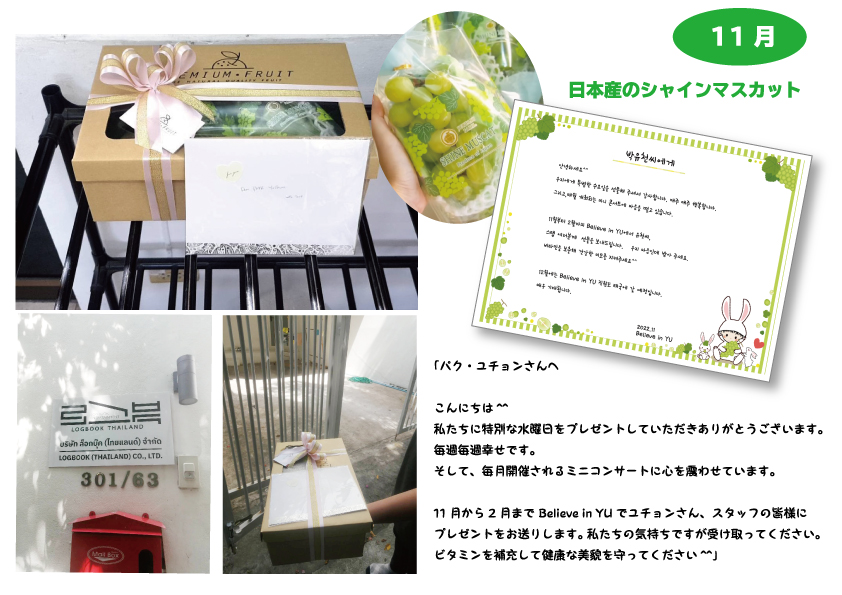 11月からは、ユチョペングループのみなさまとご一緒するサポートとは別にBelieve in YUからのクリスマスプレゼントとして11月から来年2月までの4か月間、ユチョンさんの美と健康を願って新鮮な果物を毎月お届けすることにいたしました。