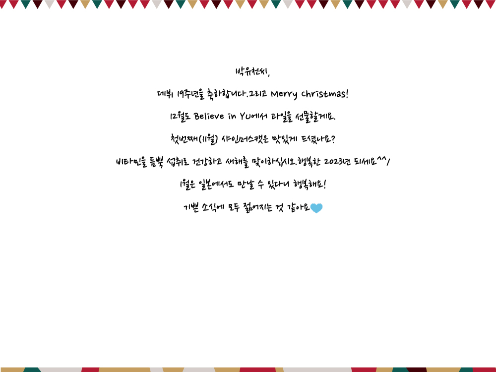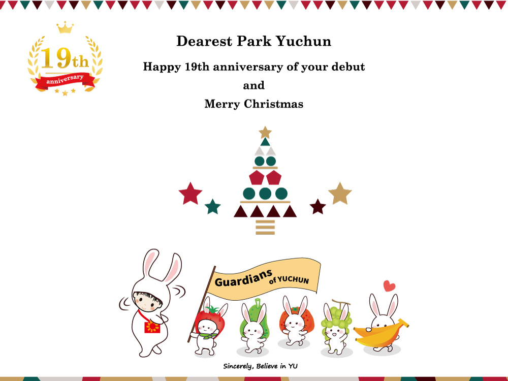 「デビュー19周年を祝います。そしてMerry Christmas! 12月もBelieve in YUで果物をプレゼントします。 最初(11月)シャインマスキャットはおいしく食べましたか? ビタミンをたっぷりと摂取して健康で新年を迎えてください。幸せな2023年になってください^^/ 1月は日本でも会えるなんて幸せですよ! 嬉しいニュースにみんな若くなると思います💙」
