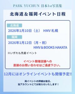 ホーム パク・ユチョン日本1st写真集 先着イベント(北海道) 2025年10月26日 パク・ユチョン日本1st写真集 先着イベント(北海道) All day 2026年1月10日 【日時】2026年1月10日(土))詳細は未定 【会場】HMV札幌 続きを読む カレンダーを表示
