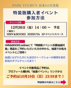 パク・ユチョン(PARK YUCHUN)日本1st写真集 発売記念イベント 10:00 AM 2025年12月26日 《当選者限定》パク・ユチョン 特典会 特装版:トークショー&韓国式サイン会&プレゼント交換会 当選者数:50名様 ダブルチャンス:落選の方にはトークショーの模様を後日配信 通常版:イベント限定ポストカードお渡し会 当選者数:50名様 【日時】2025年12月26(金) ■特装版対象イベント 開始時間:14:00~(予定) ■通常版対象イベント 開始時間:15:50~(予定) 【会場】HMV&BOOKS SHIBUYA 5F イベントスペース(東京‐渋谷) 詳細 続きを読む カレンダーを表示