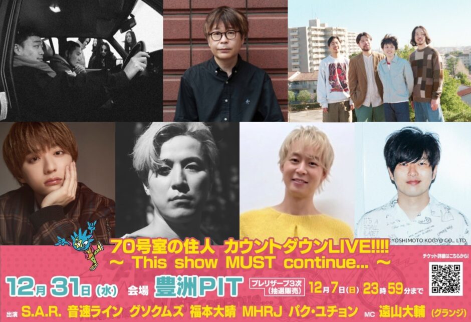 ホーム 70号室の住人カウントダウンLIVE 2025年12月4日2025年12月8日 70号室の住人カウントダウンLIVE 8:00 PM 2025年12月31日 70号室の住人 カウントダウンLIVE!!!! ~ This show MUST continue... ~ 開催日時:2025年12月31日(水) 開場 19:00/開演 20:00 ※終演予定は、25時頃。 会 場:豊洲PIT(豊洲駅から徒歩12分/新豊洲駅から徒歩2分) チケット販売は>> チケットぴあ 続きを読む カレンダーを表示
