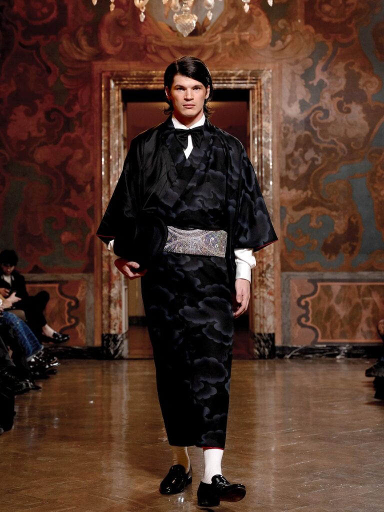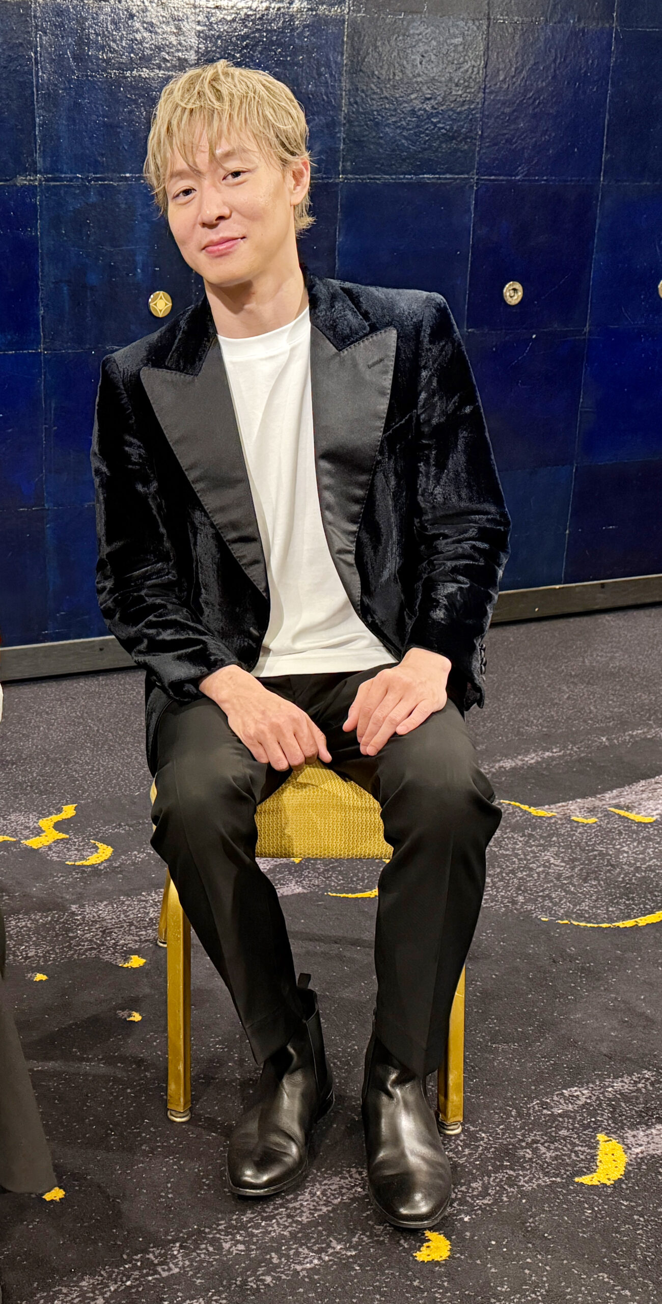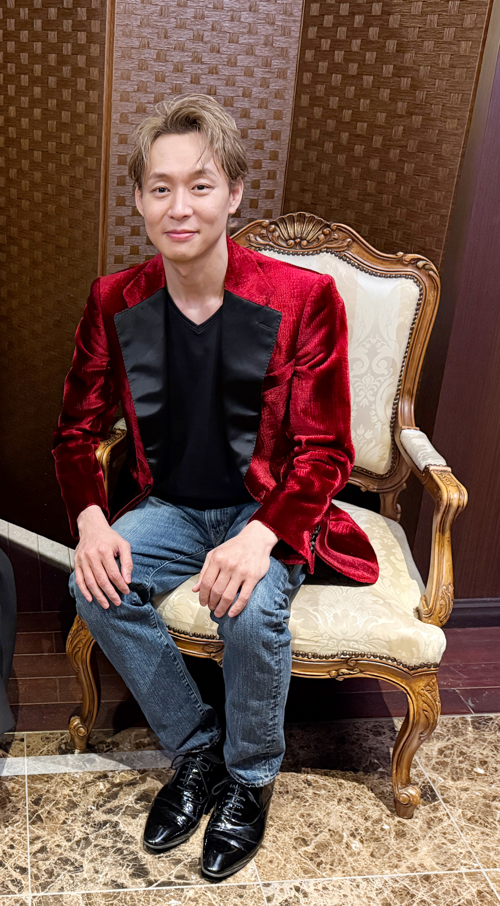 2部だけでも4着😲真っ白なタキシード姿で登場、そしてお色直しは、(遠目には)パープル系の華やかなタキシード、次にサブステに表れたのは、ミラノコレクション2025の作品で“JAPANESQUE SUSTAINABLE FORMAL”和装タキシード、アンコールでは、ジーンズに深紅のベロアジャケット(下記写真)というスタイルでした。