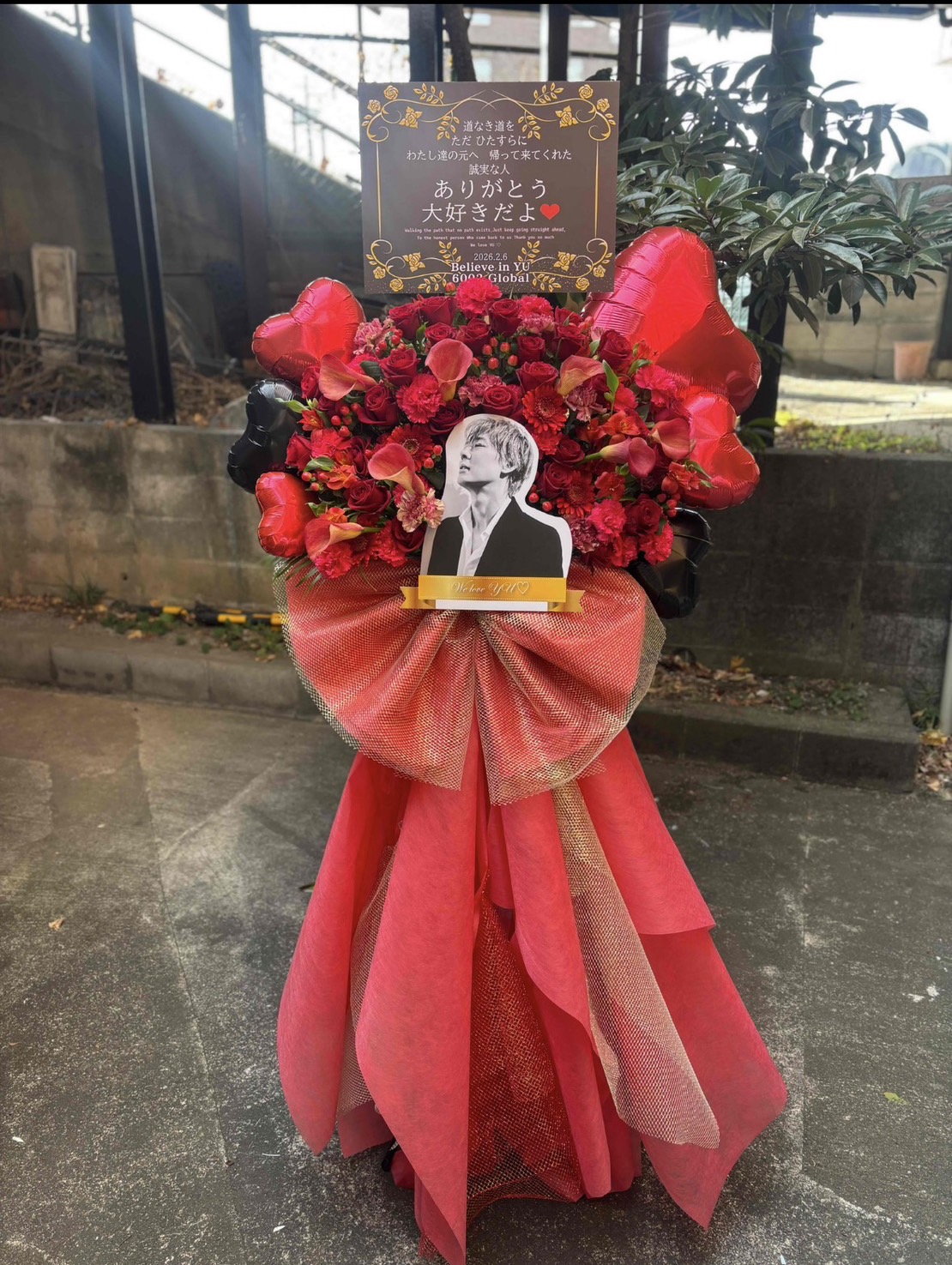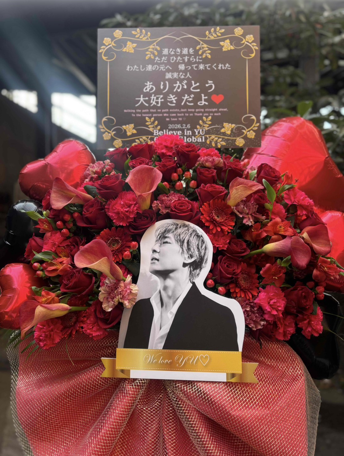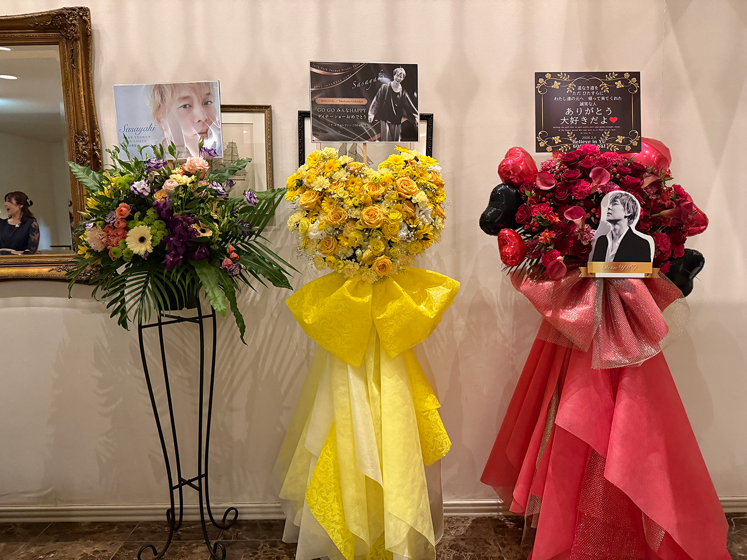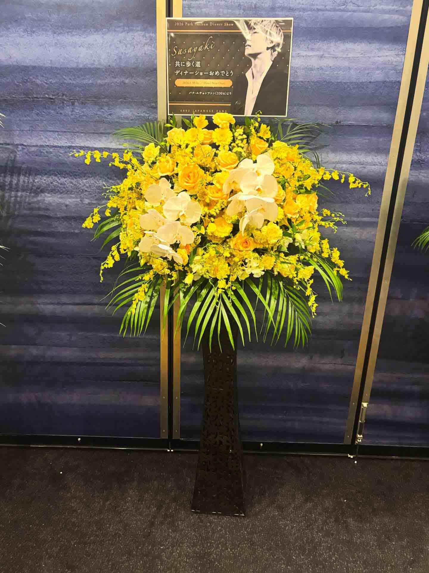 さて、今回のディナーショーでは、皆様からお預かりしたサポート基金からフラワースタンドをそれぞれの会場に出させていただきました。今回もGlobal6002(海外ファンのみなさま)と共同掲出となっています。